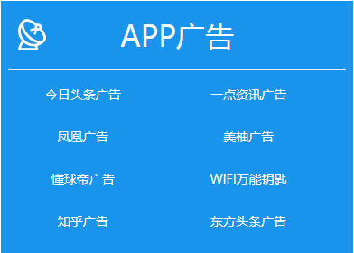 App广告资源: 今日头条广告 一点资讯广告 凤凰广告 美柚广告 懂球帝广告 WiF